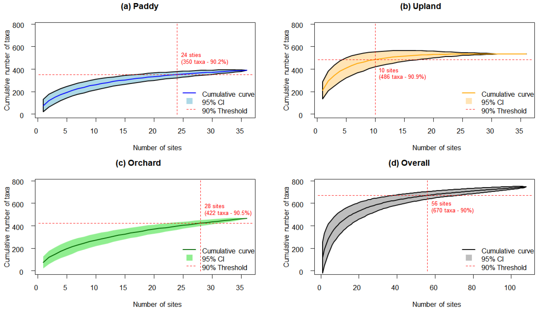 - To systematically monitor changes in agricultural plant flora resulting from climate change and agricultural environmental shifts, it is necessary to establish an appropriate number of survey sites based on scientific evidence. This study aimed to determine the minimum number of survey sites required for long-term monitoring of plant flora in major agricultural land types in Korea: paddy fields, upland fields, and orchards. Plant taxa accumulation curves were derived for each habitat type to propose the minimum number of sites for efficient nationwide surveys, and the overlap of plant taxa among habitat types was visualized using Venn diagrams. Analysis showed that upland fields required the fewest sites, identifying over 90% of the taxa with just 10 sites, followed by paddy fields (24 sites) and orchards (28 sites). When integrating all agricultural land types, over 90% of the taxa were identified with 56 sites. Venn diagram analysis clearly showed the number of taxa unique to each agricultural land type and those common across multiple agricultural land types. These findings provide a scientific basis for establishing a long-term monitoring system for the agricultural plant flora of Korea and are expected to contribute to the formulation of agroecosystem management policies in response to climate change.