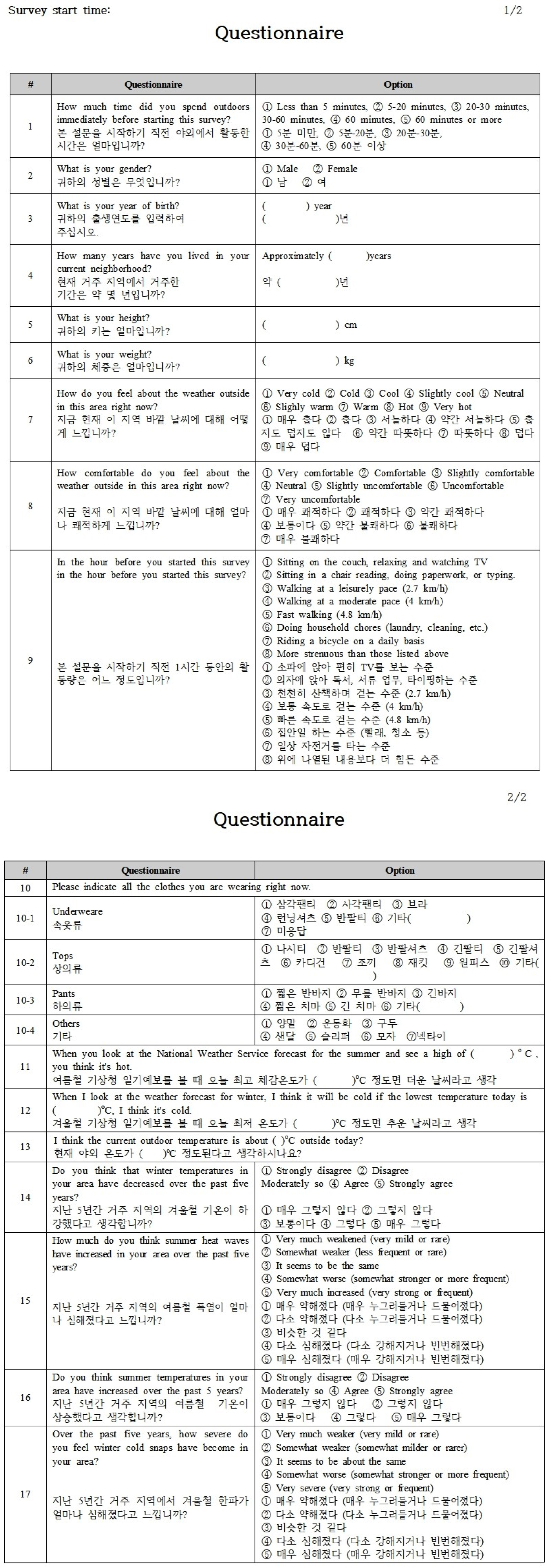 - This study aimed to address the limitations of traditional temperature indicators based solely on daily maximum air temperature, which fail to fully capture the actual thermal environment experienced by the Korean people. It evaluated the consistency and validity of the Korean Perceived Temperature (PT) and the Korea Meteorological Administration’s Wet-Bulb Globe Temperature-based index (WBGTk). A total of six outdoor surveys and microclimate observations were conducted in Seoul and Suwon to analyze the correlations between citizens’ thermal sensation and thermal comfort levels and the respective indices. PT showed the highest coefficient of determination (R2=0.991) with thermal sensation, while the WBGTk index showed the strongest coefficient of determination with thermal comfort (R2=0.986). These findings indicate that PT and WBGTk are the most suitable indicators for representing citizens’ perceived heat and comfort and provide a scientific basis for their effective application in future heatwave response policies and public health protection systems.